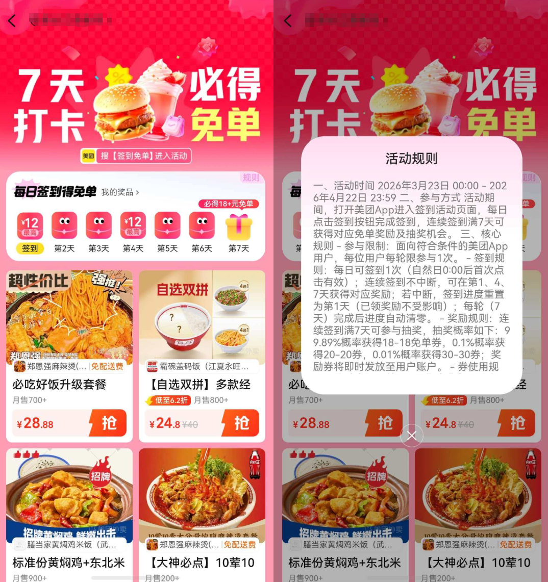 美团用户注意了!签到7天必得免单红包活动正在进行中,打开美团APP搜索【签到免单】,连续签到7天,保底必得18-18元免单券,点外卖直接0元!
